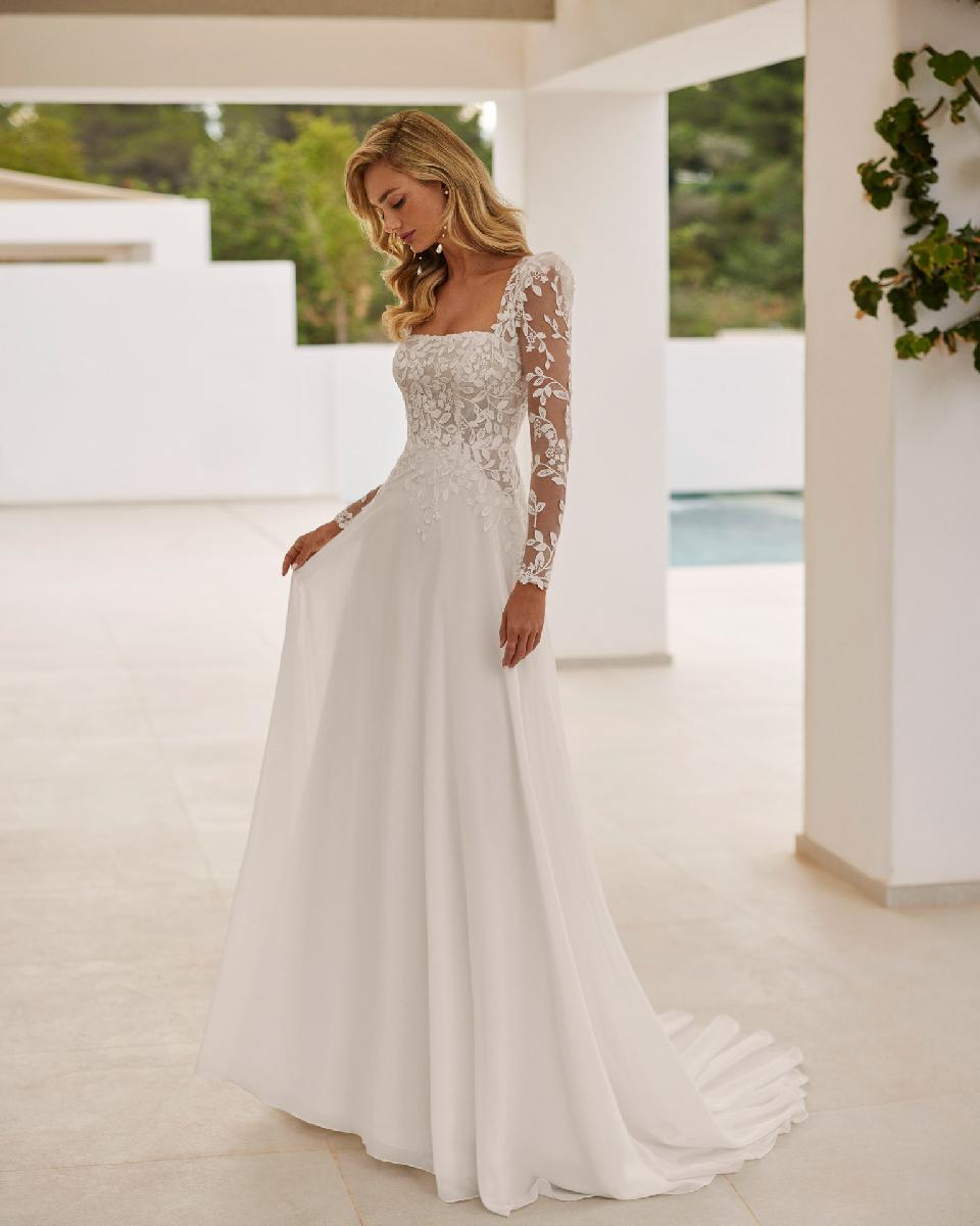Este vestido captura la esencia de una novia que busca elegancia clásica con un toque de romanticismo contemporáneo. Su corte en A se despliega con una caída ligera y fluida, envolviendo cada movimiento en una atmósfera de naturalidad y gracia.