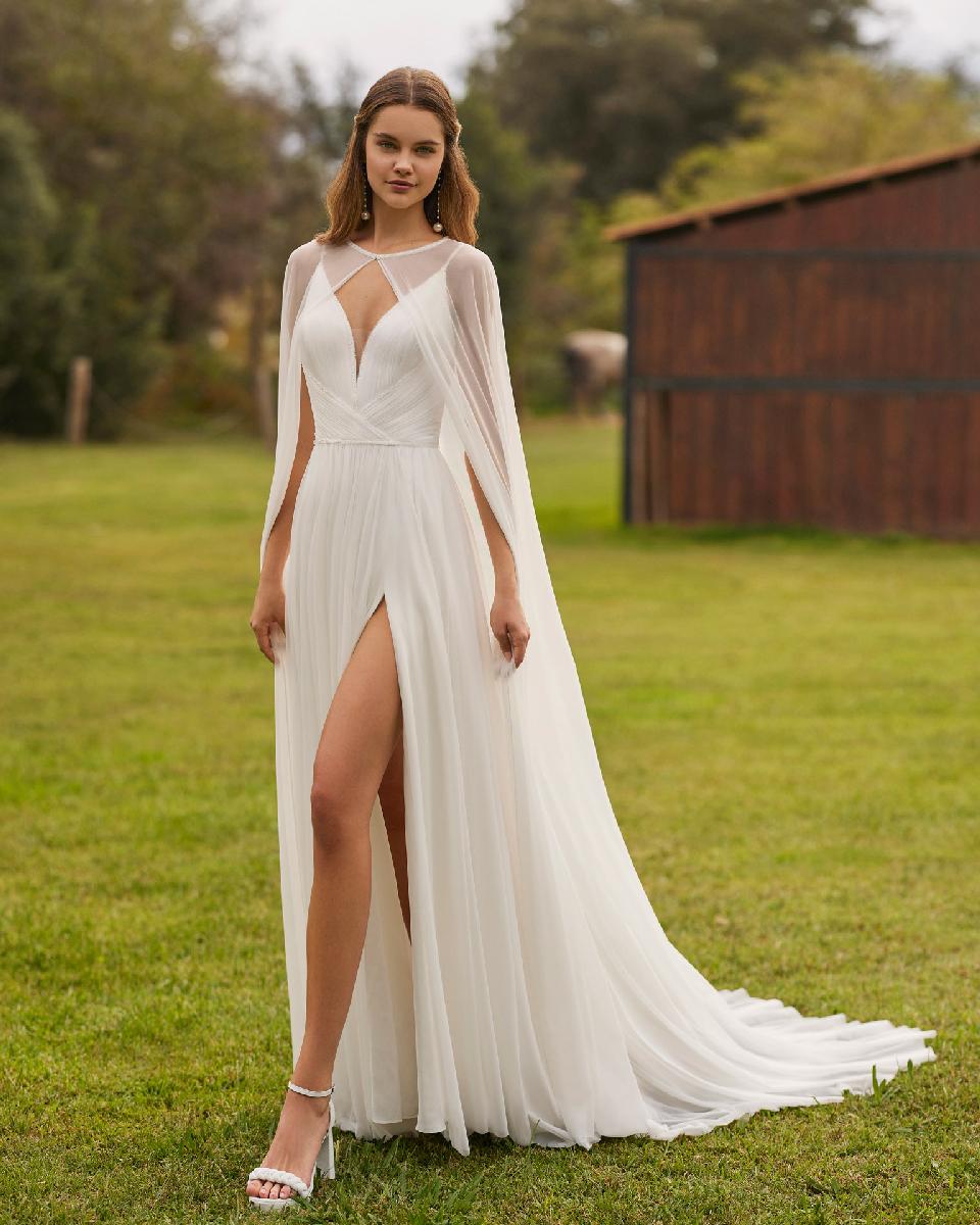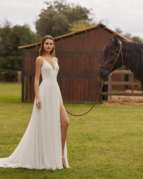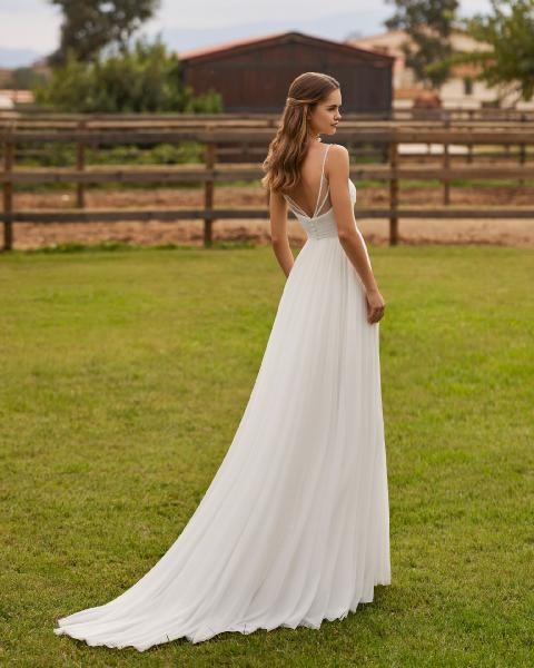 Este vestido es una oda a la ligereza y a la delicadeza, pensado para la novia que sueña con caminar hacia el amor envuelta en una elegancia etérea. Su corte en A estiliza la silueta con naturalidad, mientras que la falda de gasa cae suavemente al suelo, creando un movimiento fluido y envolvente que parece flotar con cada paso.