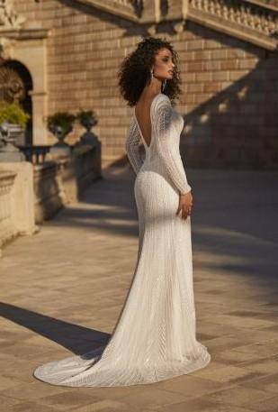 La espalda abierta, también en V, culmina con una cola fluida que se desliza con gracia, dejando una estela de luz y sofisticación. Cada detalle de este vestido está pensado para hacerte sentir fuerte, radiante y absolutamente única en tu gran día.