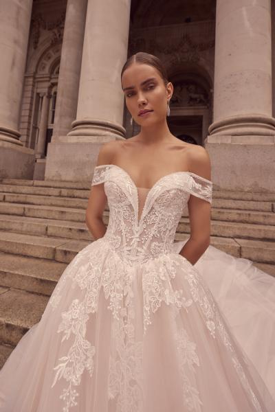 Este diseño convierte cada paso en un susurro de elegancia. Su corte princesa abraza la figura con suavidad antes de abrirse en una falda etérea que flota como un sueño. El escote off-the-shoulder, delicadamente estructurado, revela una feminidad serena y luminosa, mientras los encajes florales bordados parecen dibujar caricias sobre la piel.